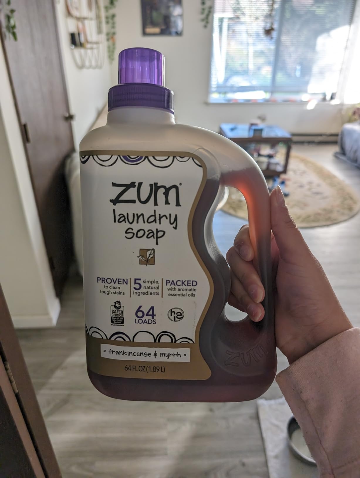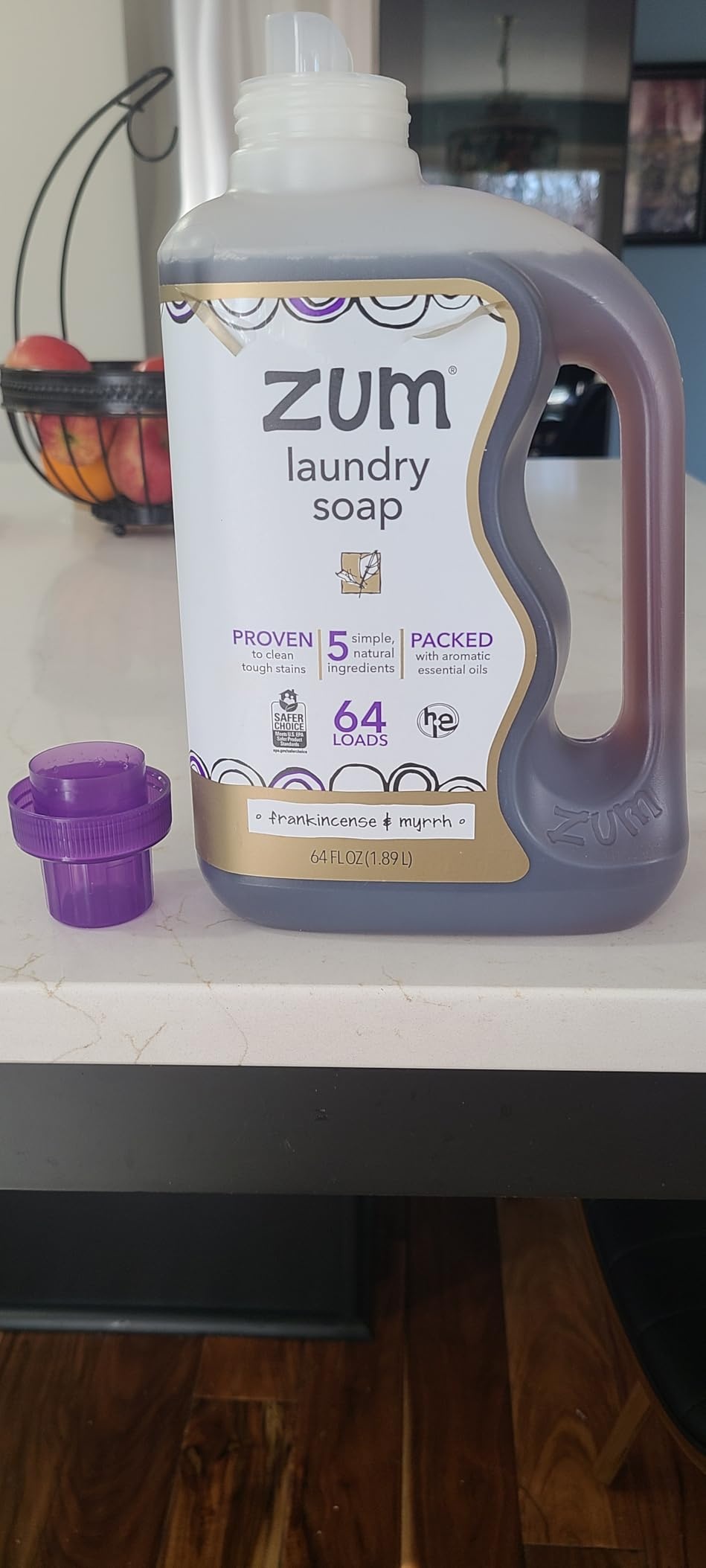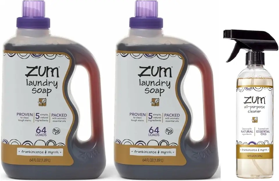Zum Frankincense & Myrrh Plant-Based Liquid Laundry Soap – 64 fl oz, 2-pack plus bonus 16 fl oz all-purpose surface cleaner. Luxurious scent and natural cleaning power for laundry and home surfaces.